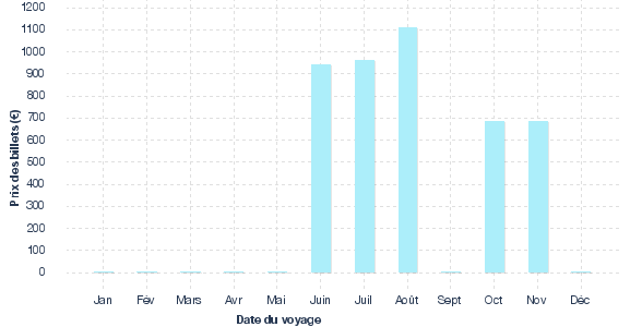Evolution des tarifs issue des historiques de prix relevés pour des vols Aller Retour Milan - Denpasar Bali